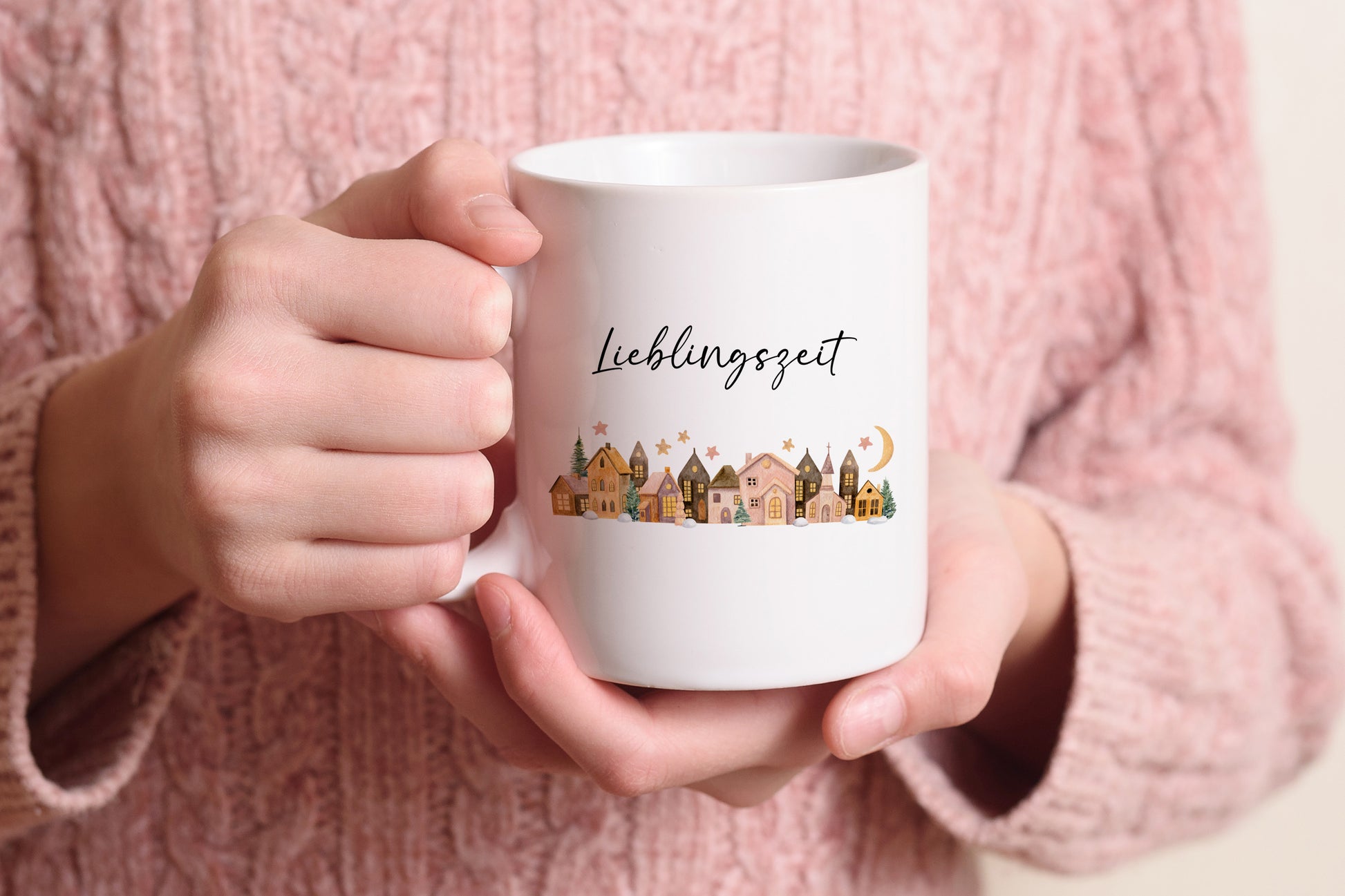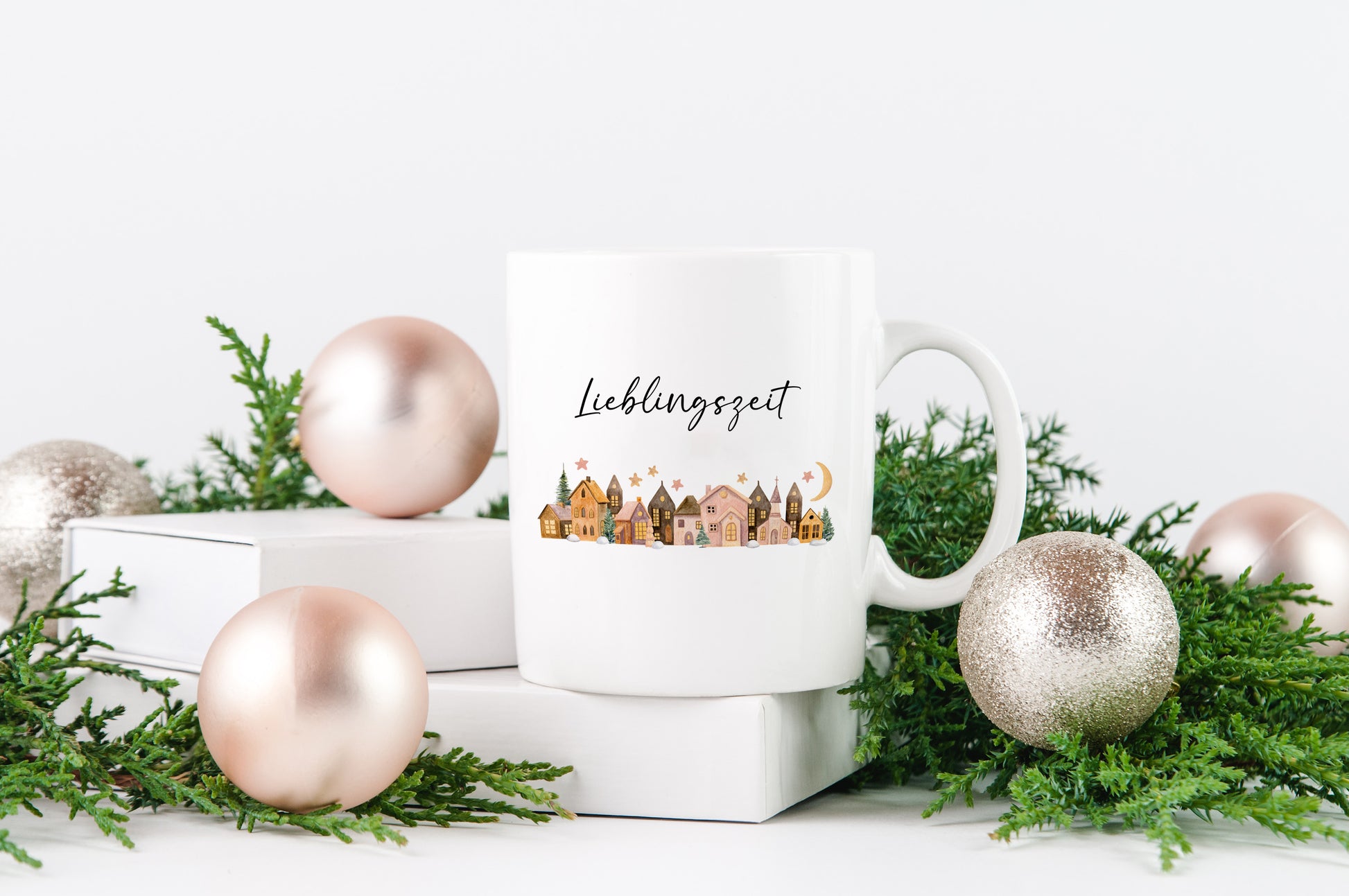 Die Tasse mit dem Weihnachtsmotiv ist ein ideales Geschenk, um fröhliche Feiertage zu wünschen.