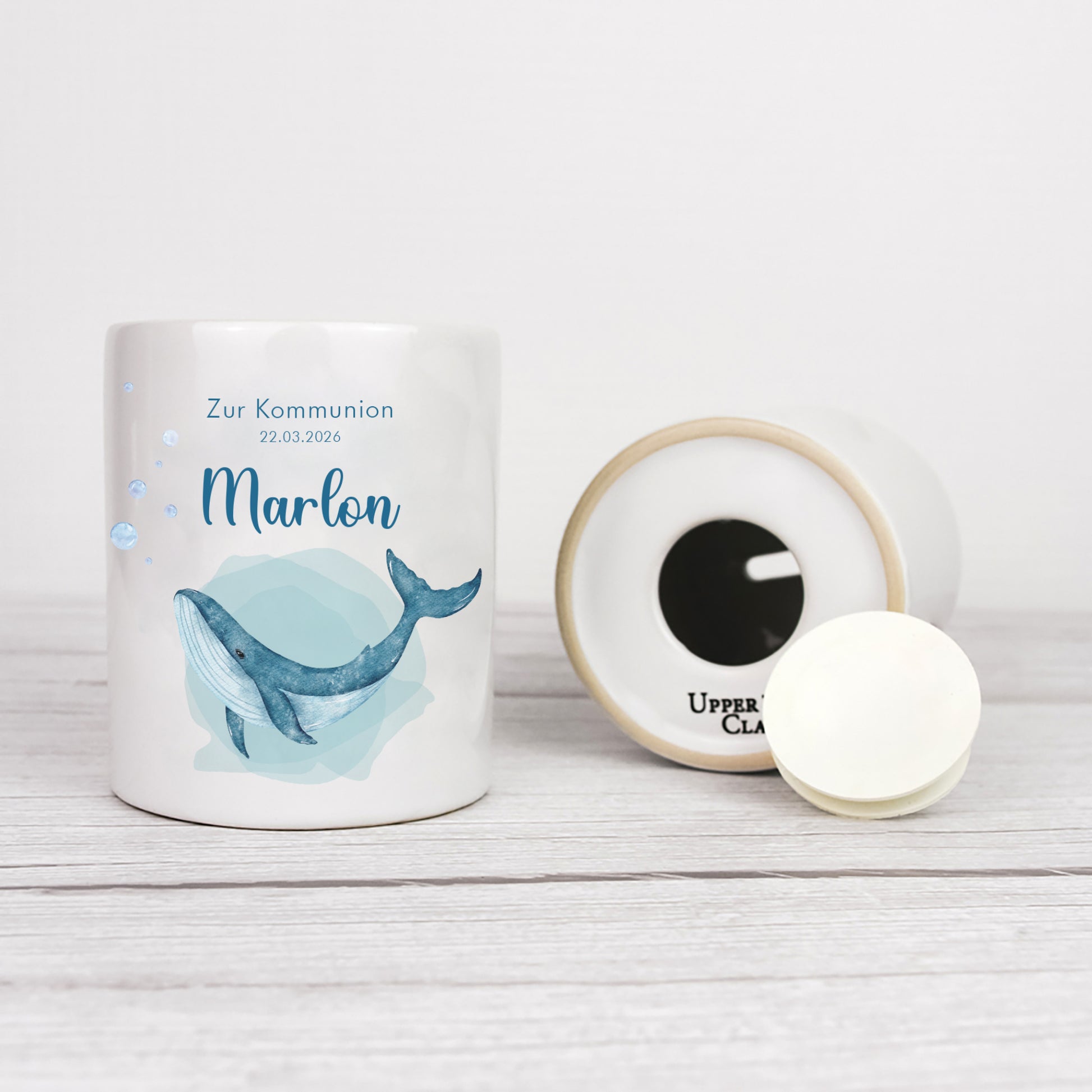 Diese personalisierte Spardose mit großem Wal-Motiv ist ein stilvolles Geschenk zur Kommunion, Konfirmation oder Taufe 🕊️ Der ruhig gestaltete Wal in sanften Blautönen wirkt modern und zeitlos. Er steht symbolisch für Stärke, Vertrauen und Schutz – Werte, die besonders gut zu einem christlichen Anlass passen.