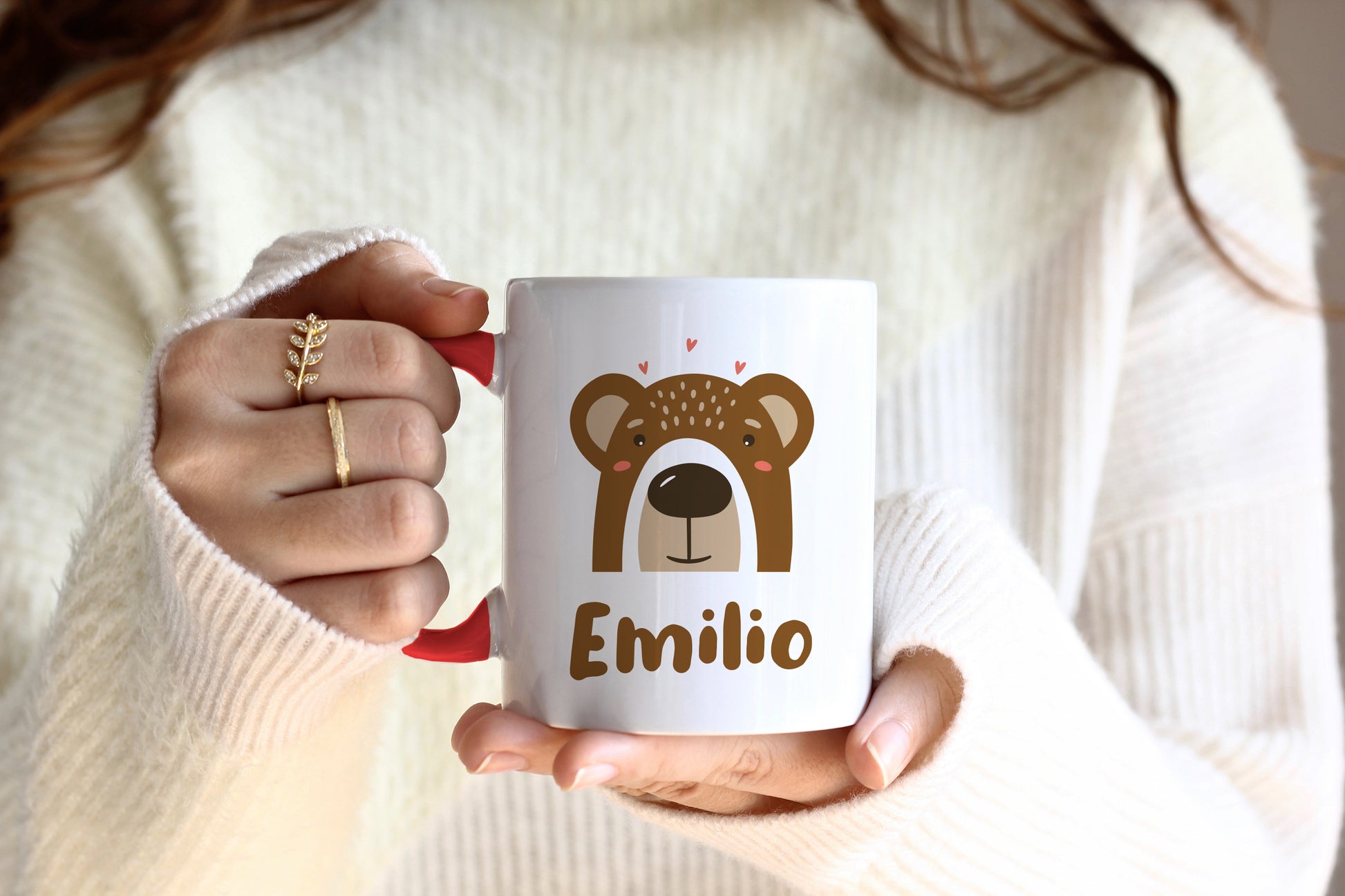 Personalisierte Keramiktasse mit Wunschnamen – Fluffiger Bär & roter Henkel
