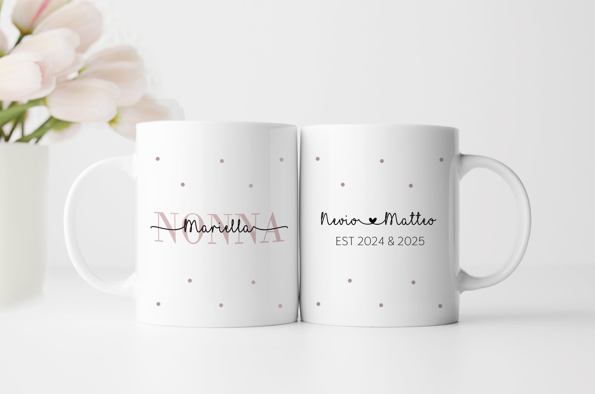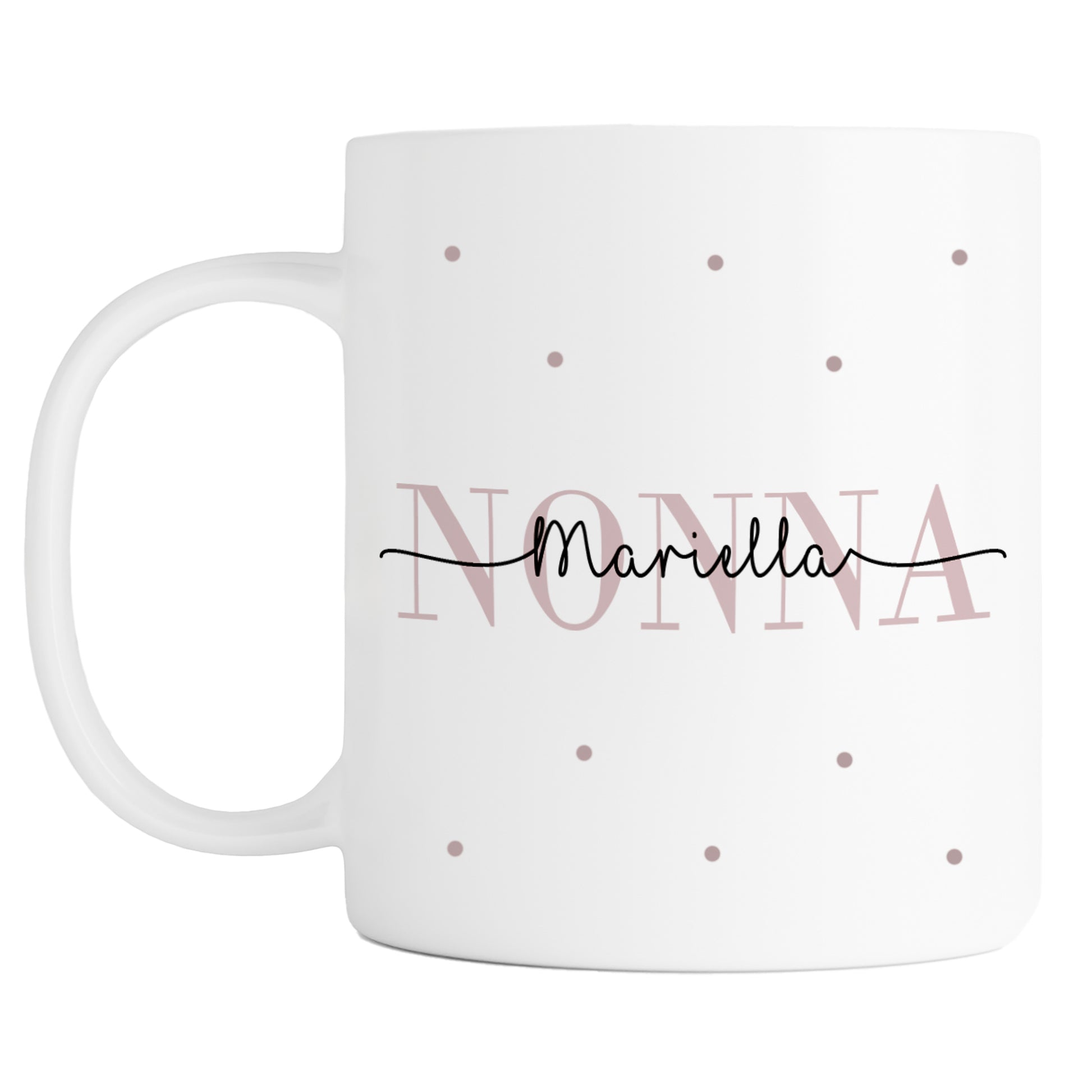 Die Namenstasse aus Keramik ist beidseitig bedruckt, auf der einen Seite ist die Tasse bedruckt mit Nonna in rosa und ihrem Vornamen. Auf der anderen Tassenseite sind bis zu drei Enkelnamen mit dem jeweiligen Geburtsjahren möglich.