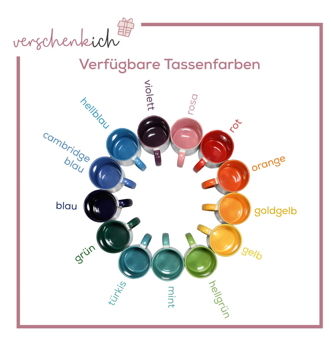 Du kannst die Tasse mit einem Wunsch-Namen personalisieren und aus 4 verschiedenen Schriftarten wählen, um das Design genau nach deinem Geschmack zu gestalten. Auf Wunsch stehen 13 verschiedene Tassenfarben zur Auswahl, damit du das perfekte Farbschema für das Geschenk finden kannst.