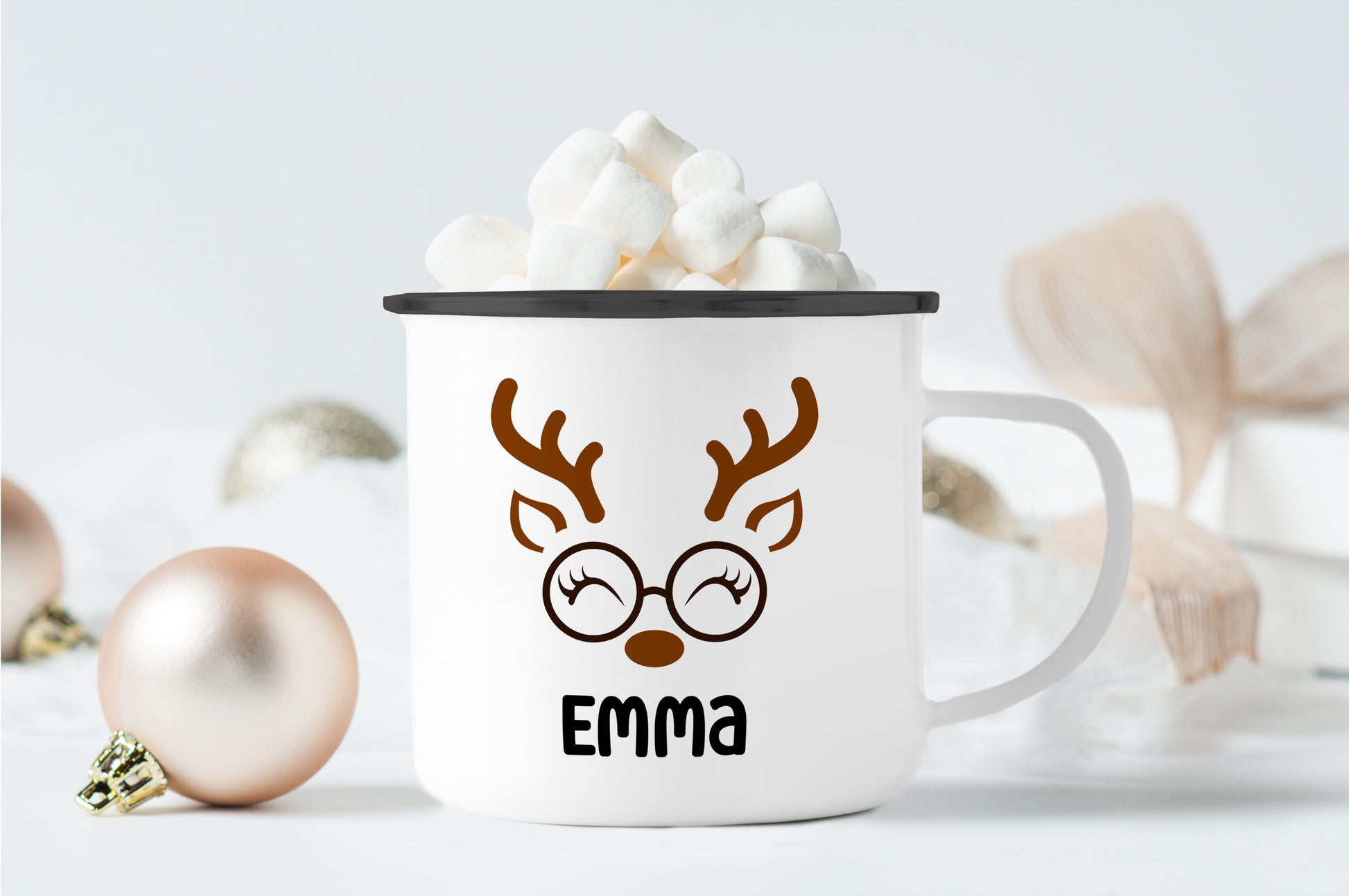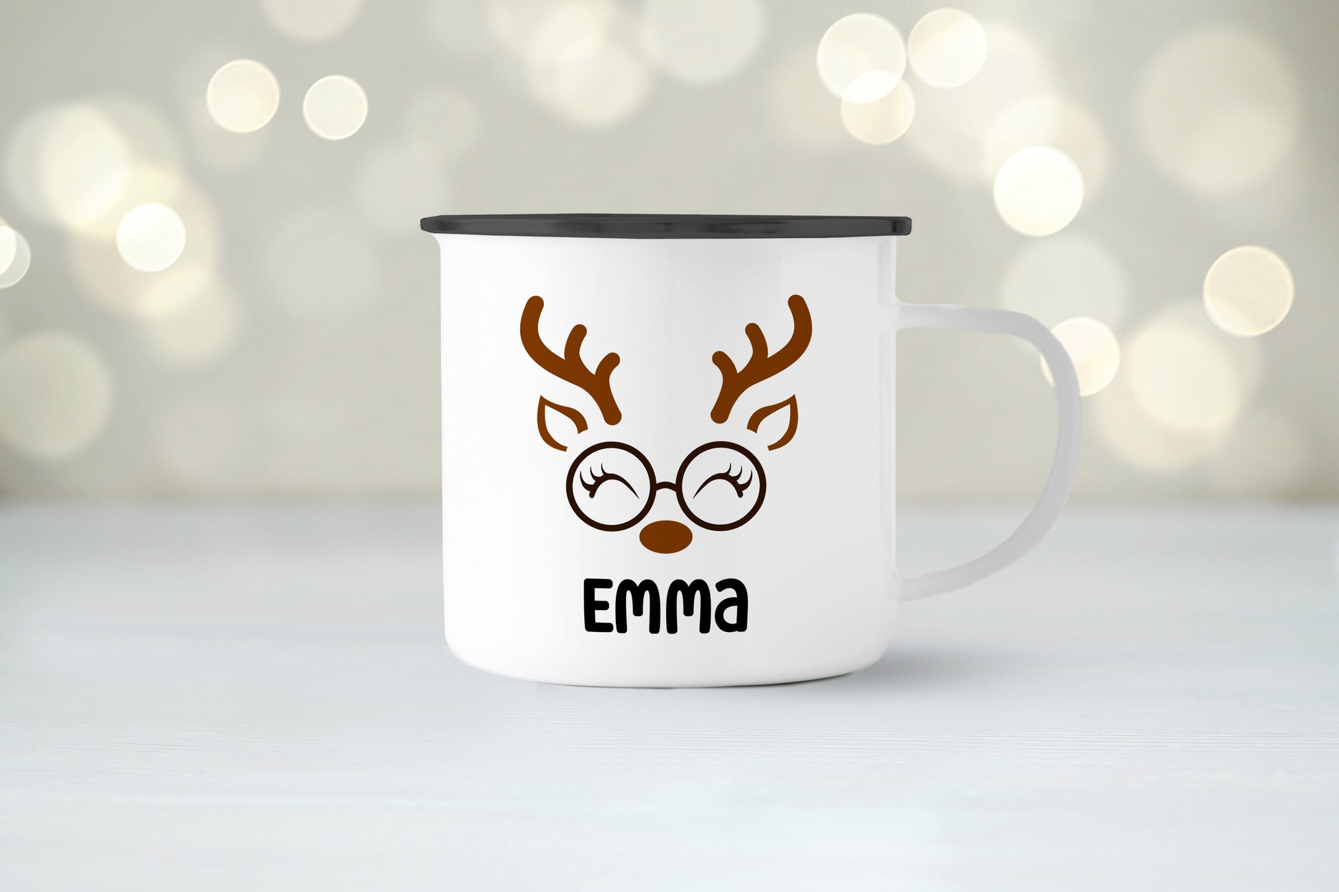 Doppelseitig bedruckte Emailletasse mit schönem Weihnachtsmotiv.