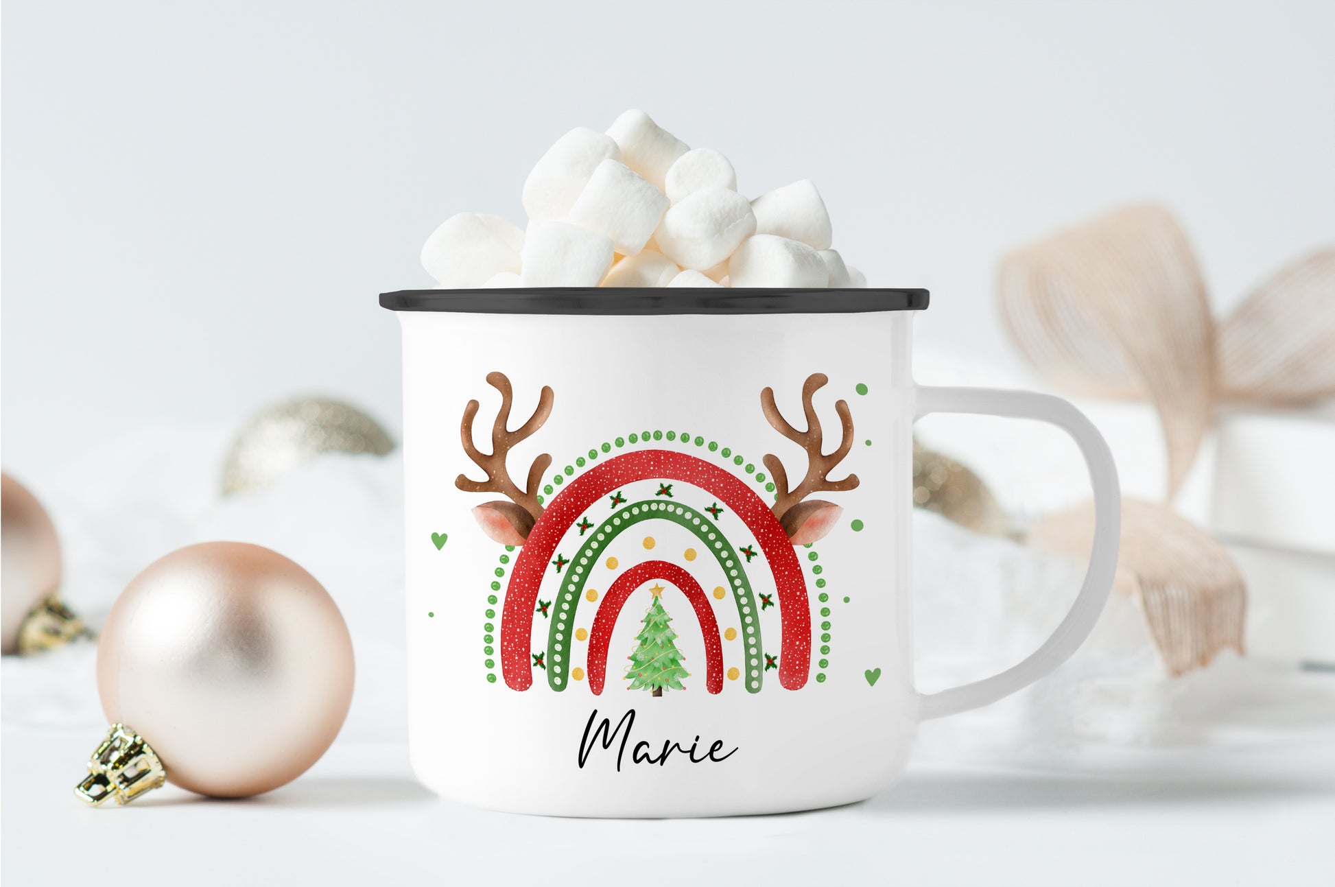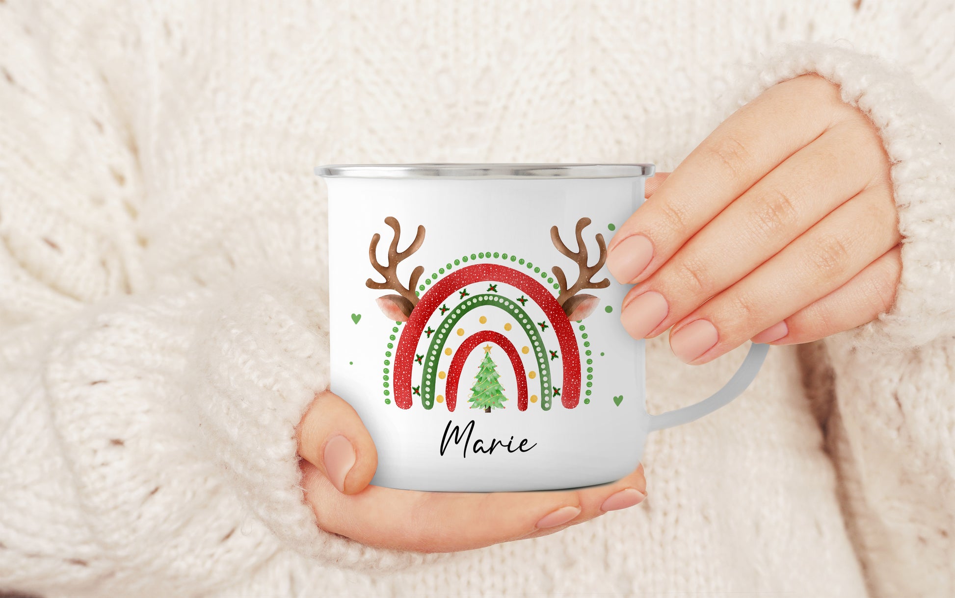 Emaille Tasse mit Name | Weihnachts- Regenbogen