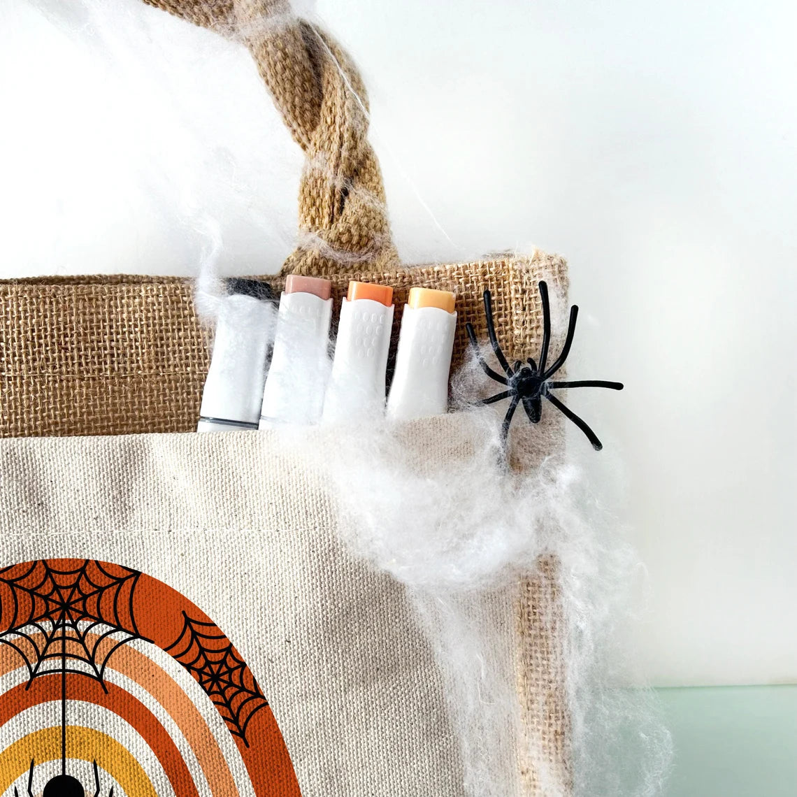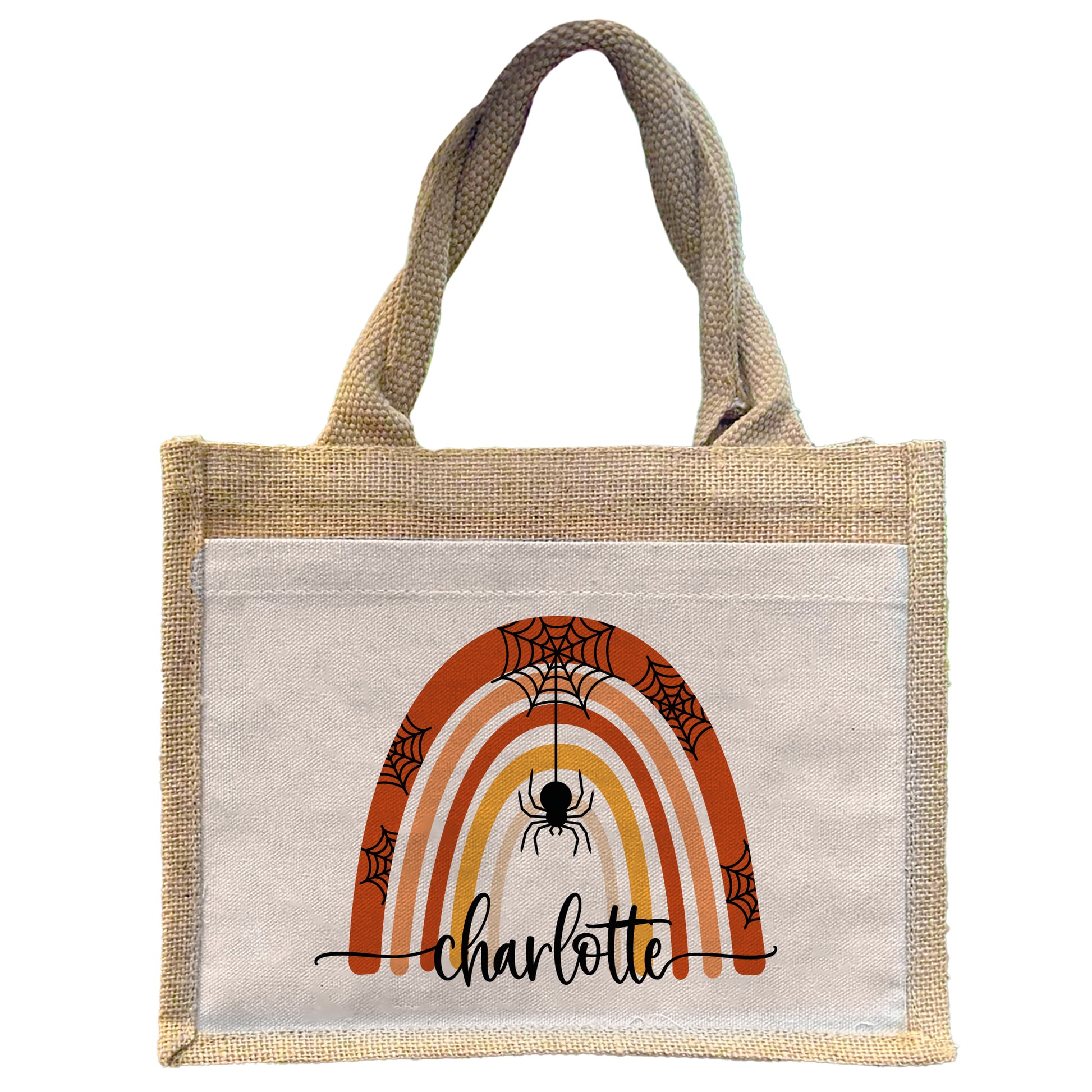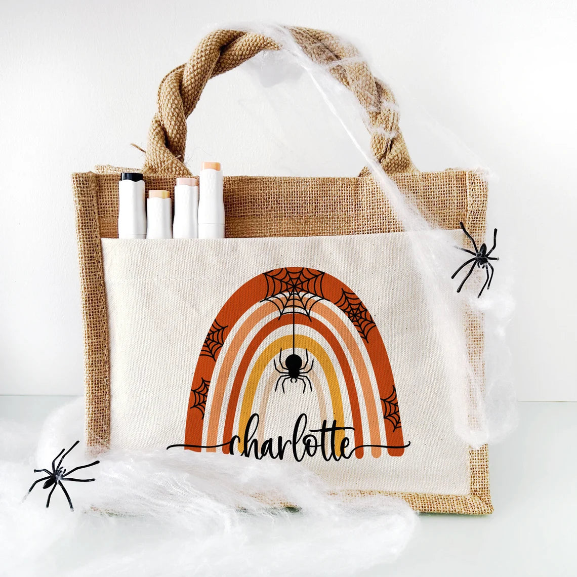 Einseitig bedruckte Jutetasche mit aufgesetzter Tasche aus Baumwolle mit Wunschnamen und Halloween Motiv. Erhältlich auch mit weiteren Motiven zum Thema Halloween.