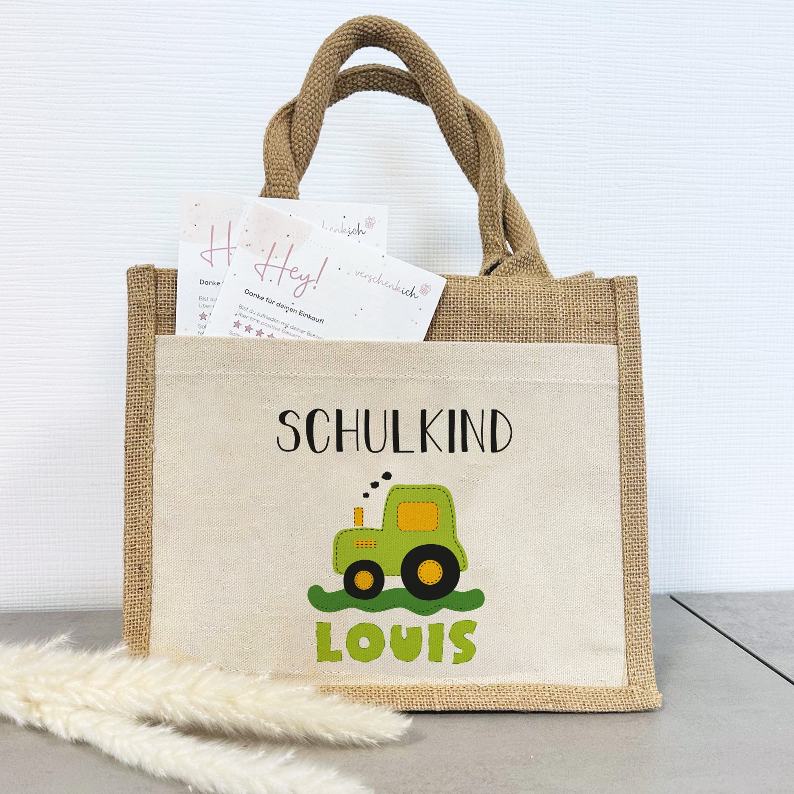 Jute Pocket Tasche mit Namen | Schulkind Traktor grün