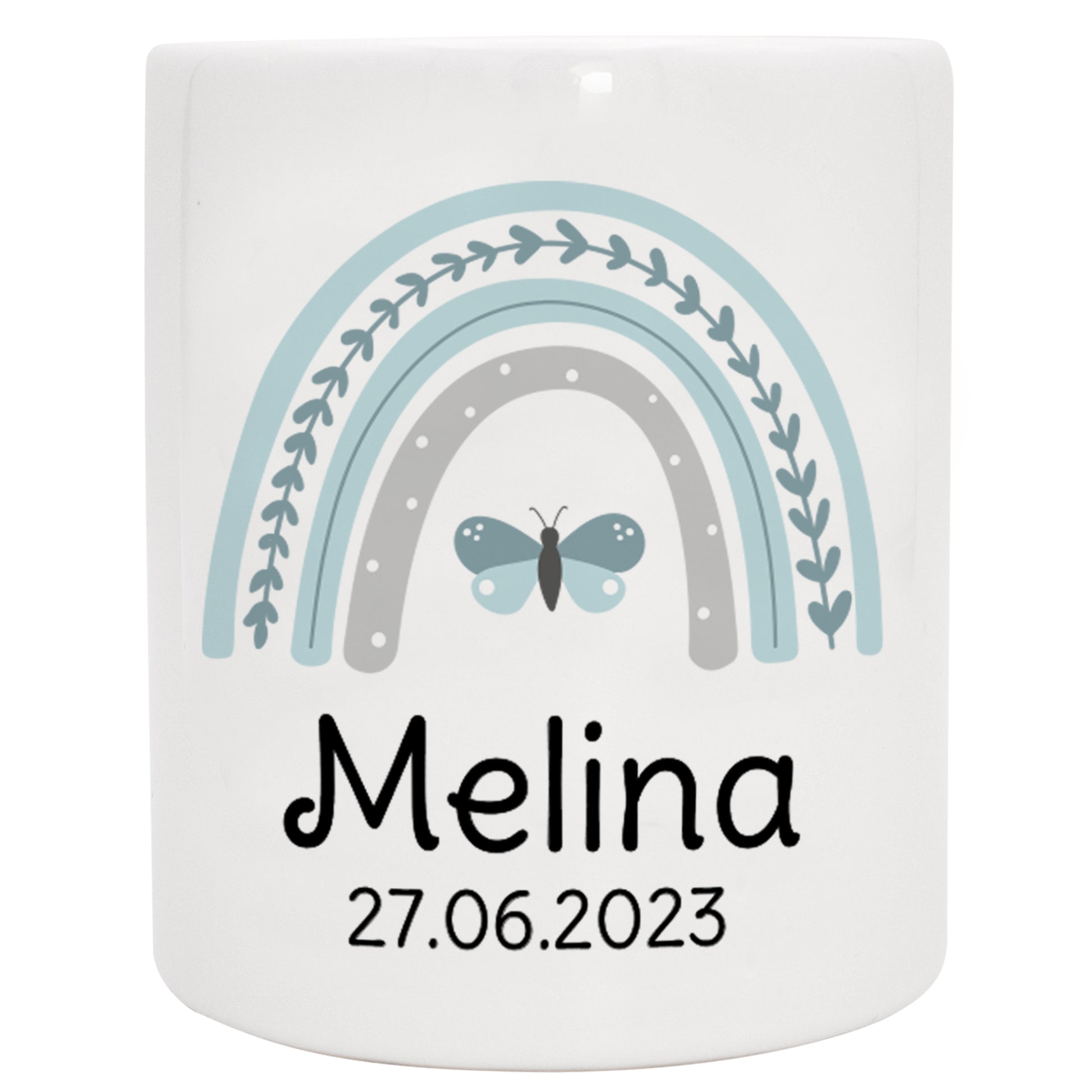 Keramik Spardose mit Name + Datum | Regenbogen mint