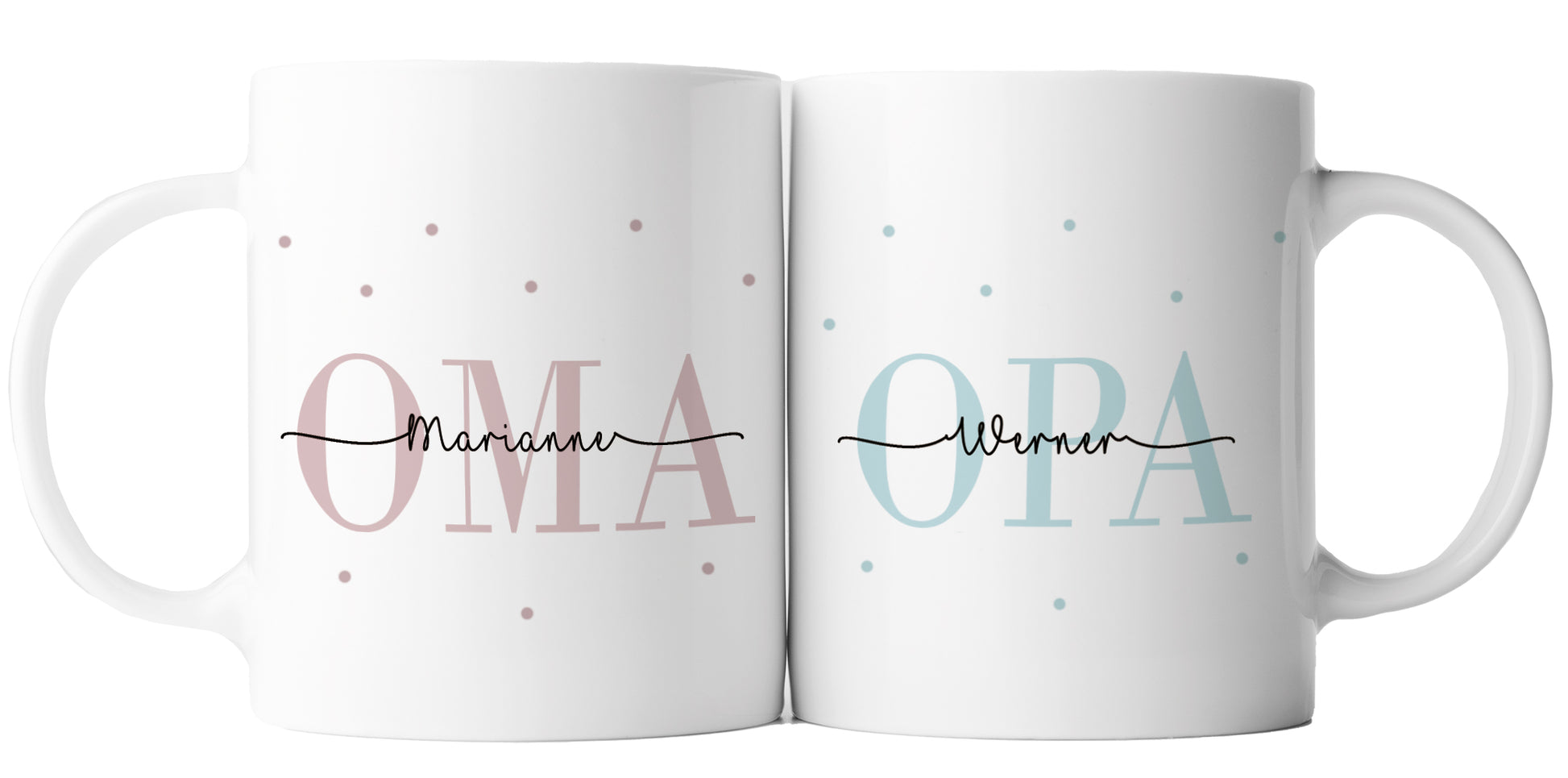 Die Namenstassen aus Keramik sind beidseitig bedruckt, auf der einen Seite sind die Tassen jeweils bedruckt mit Oma in rosa, Opa in blau und ihren Vornamen. Auf der anderen Tassenseite sind bis zu drei Enkelnamen mit dem jeweiligen Geburtsjahren möglich.