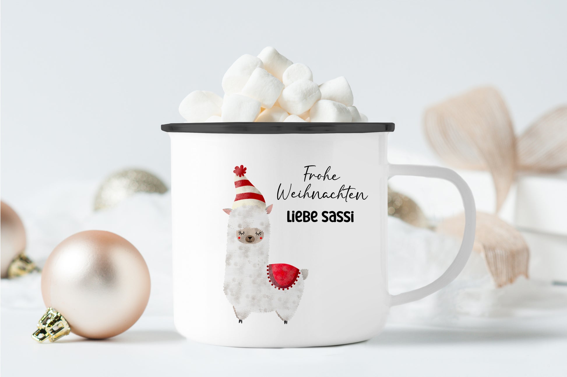 Doppelseitig bedruckte Emailletasse mit schönem Weihnachtsmotiv.