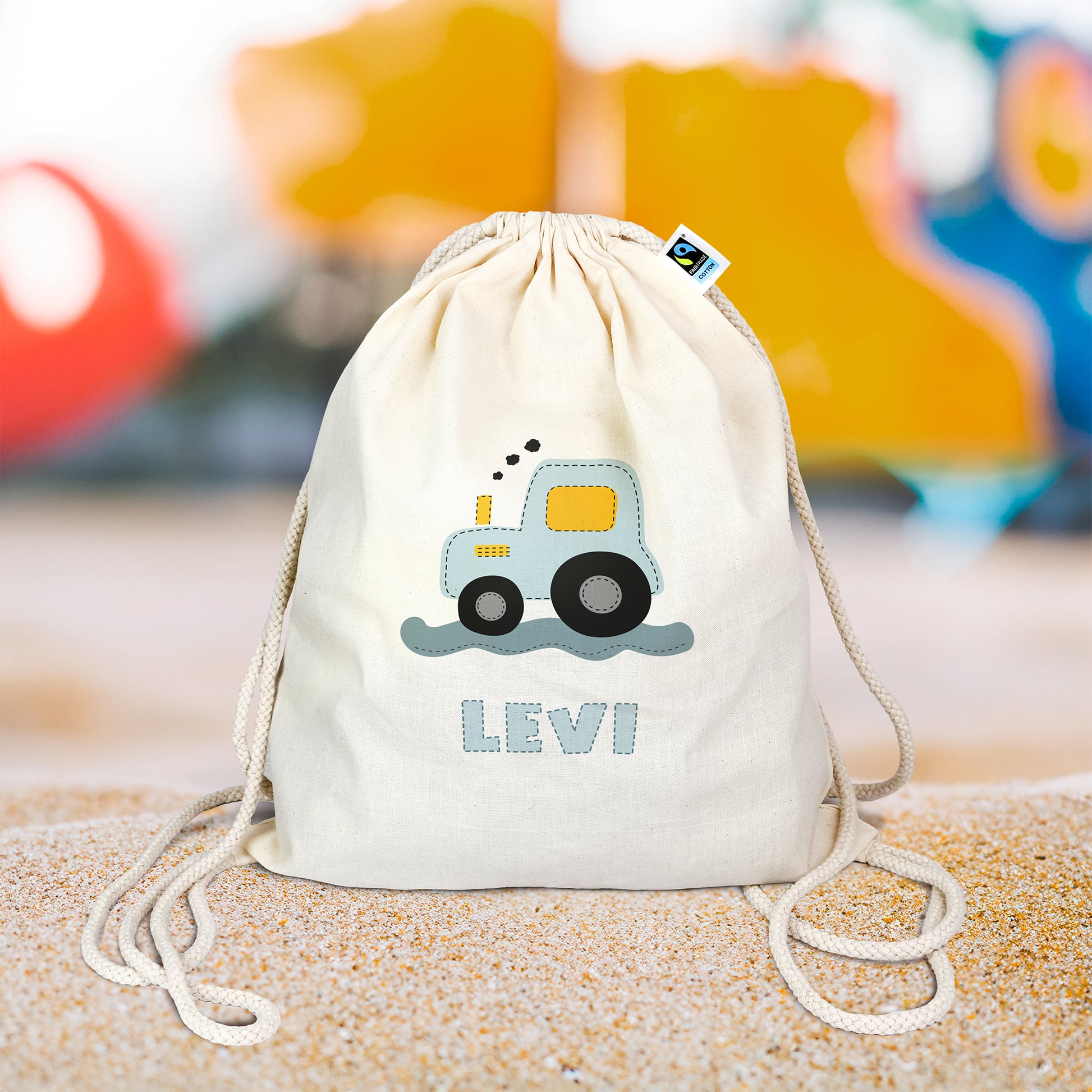 Turnbeutel aus Bio- Baumwolle mit Name | Traktor blau