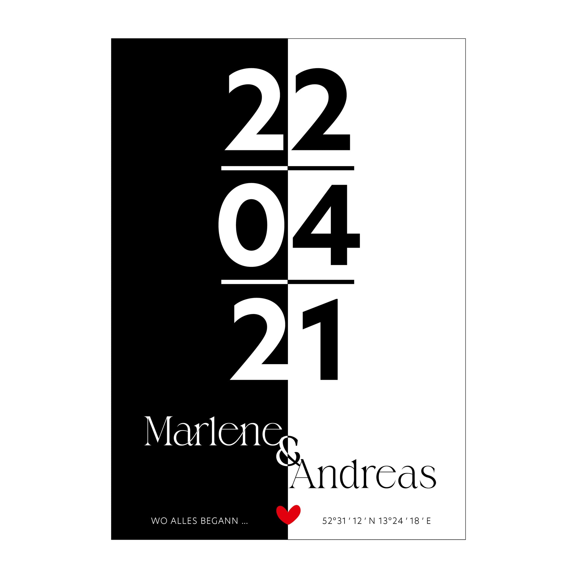Datum, Namen und auf Wunsch die Koordinaten eures besonderen Ortes werden präzise und harmonisch in das schwarz-weiße Design integriert. Unter den Namen kannst du zusätzlich einen kurzen Text auswählen oder das Poster ganz bewusst schlicht halten.