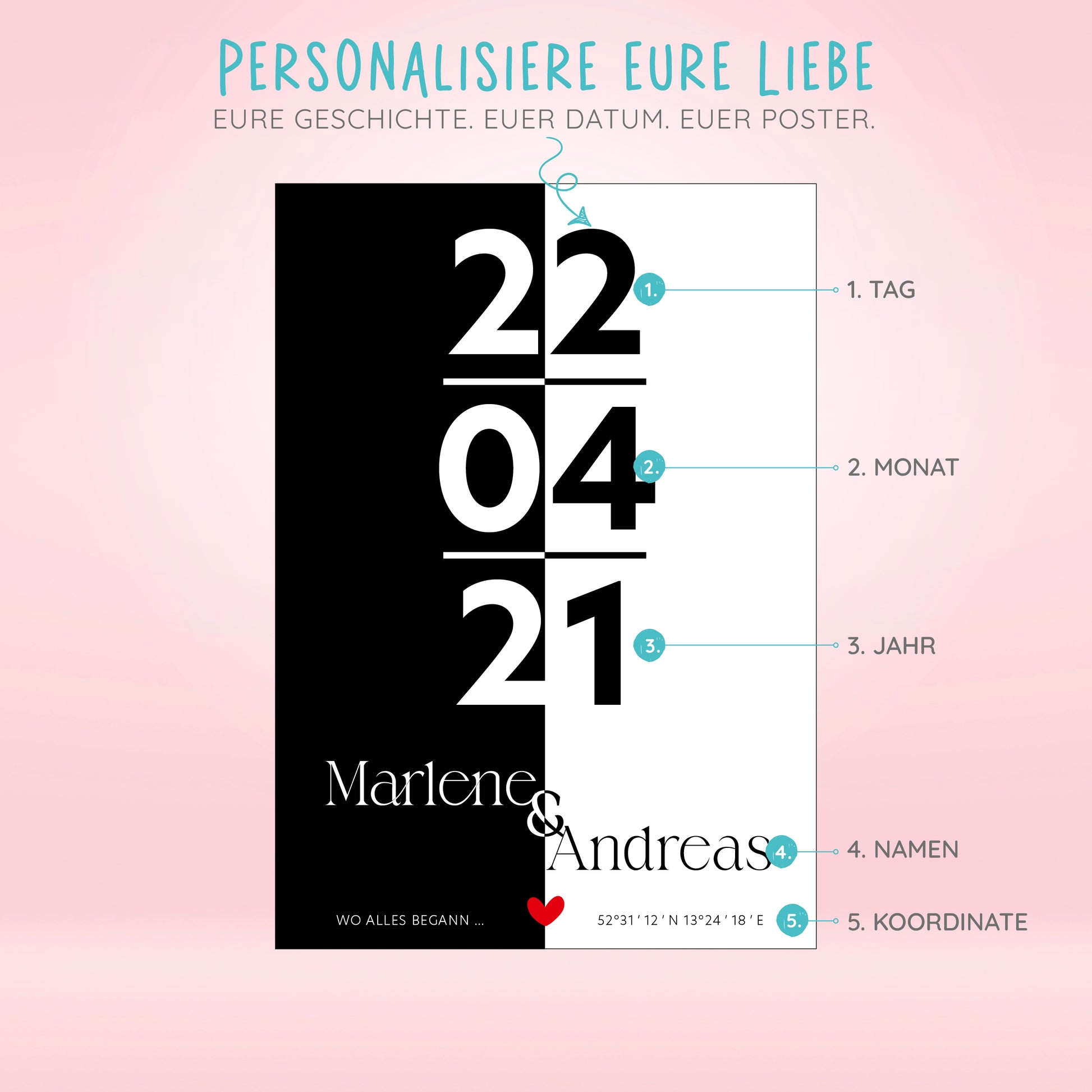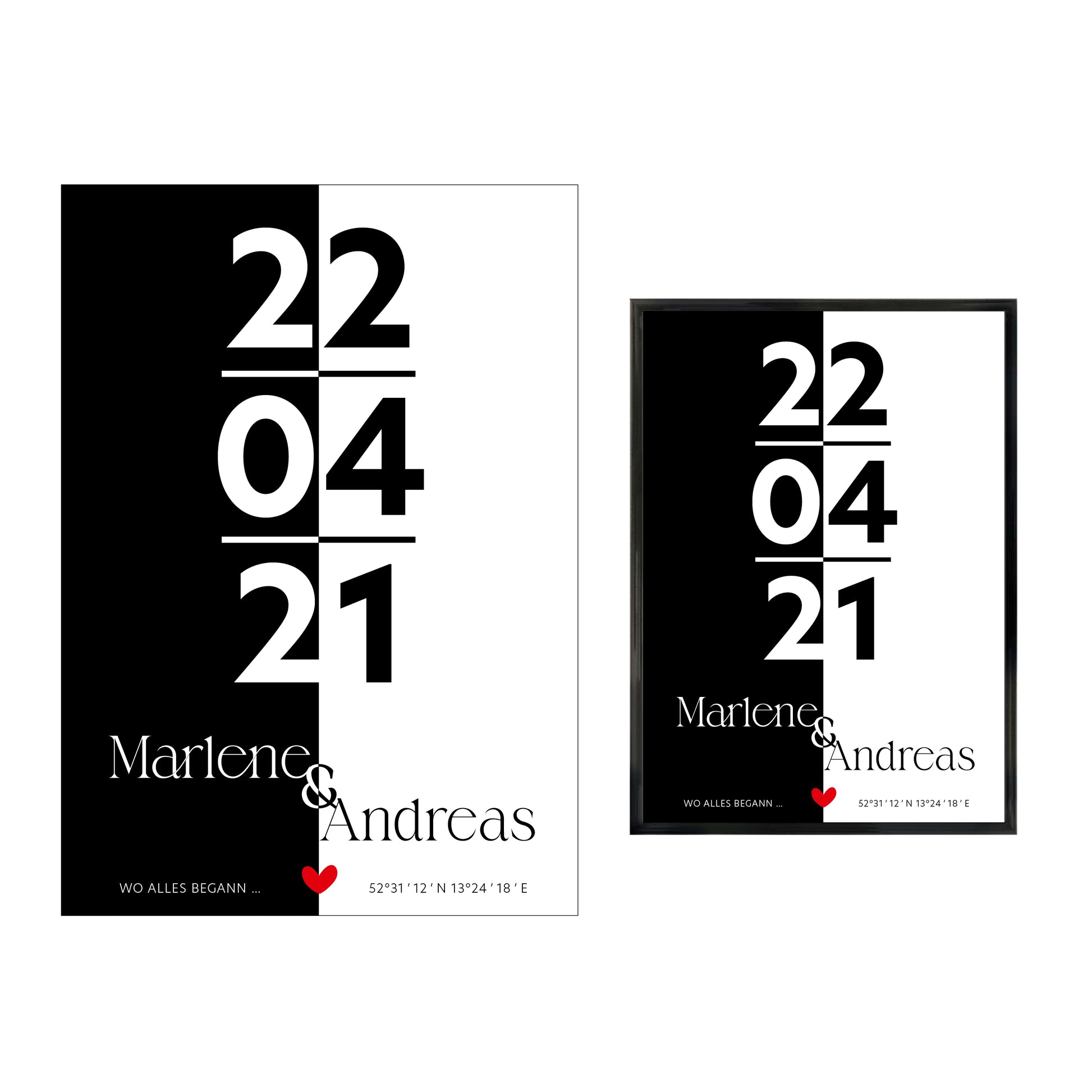 Ein besonderes Datum verdient einen klaren, zeitlosen Rahmen. Dieses personalisierte Koordinaten-Poster in Schwarz-Weiß verbindet Namen, Datum und auf Wunsch die Koordinaten eures Kennenlernorts zu einem minimalistischen Wandbild für Paare. Das reduzierte Design setzt bewusst auf Kontraste und Klarheit und macht das Poster zu einer stilvollen Erinnerung – ideal als Geschenk zum Valentinstag, zum Jahrestag oder als modernes Zeichen eurer gemeinsamen Geschichte.