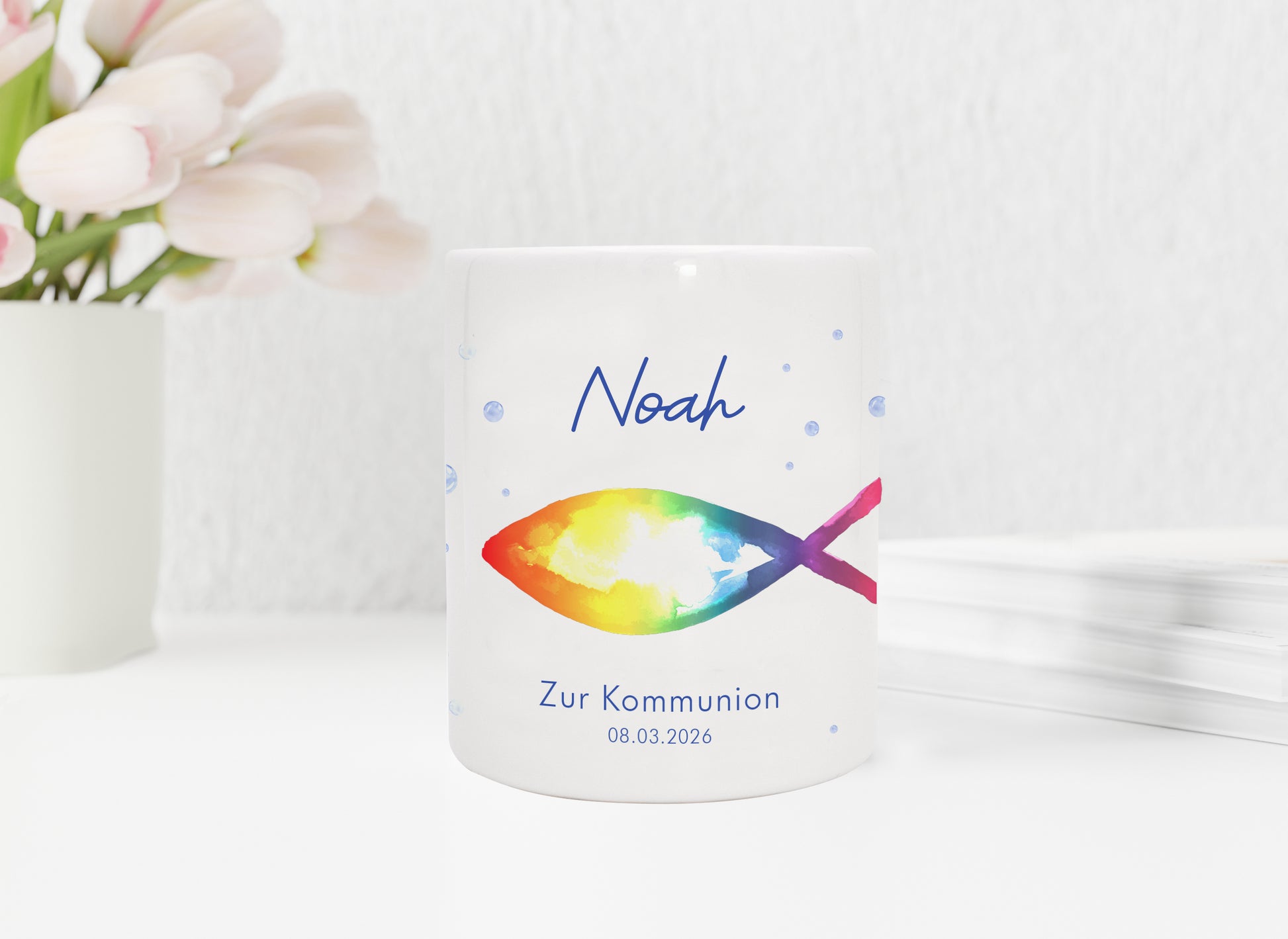 Diese personalisierte Spardose mit Fisch-Motiv ist ein besonderes Geschenk zur Taufe, Kommunion oder Konfirmation. Der moderne Regenbogen-Fisch im Ichthys-Design steht als christliches Symbol für Glaube, Hoffnung und Segen – zeitlos, klar und zugleich liebevoll gestaltet.