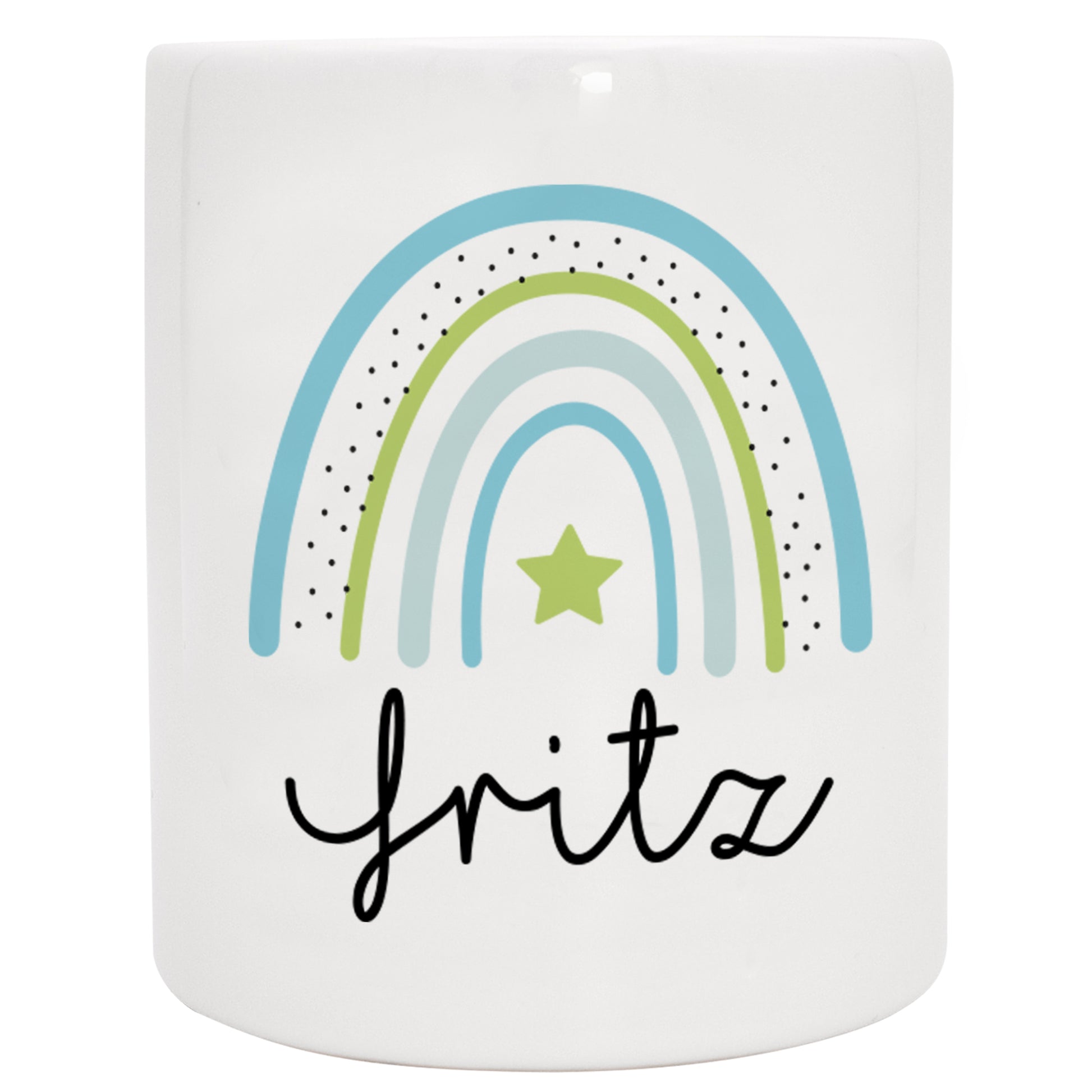 Keramik Spardose mit Name | Regenbogen blau- grün