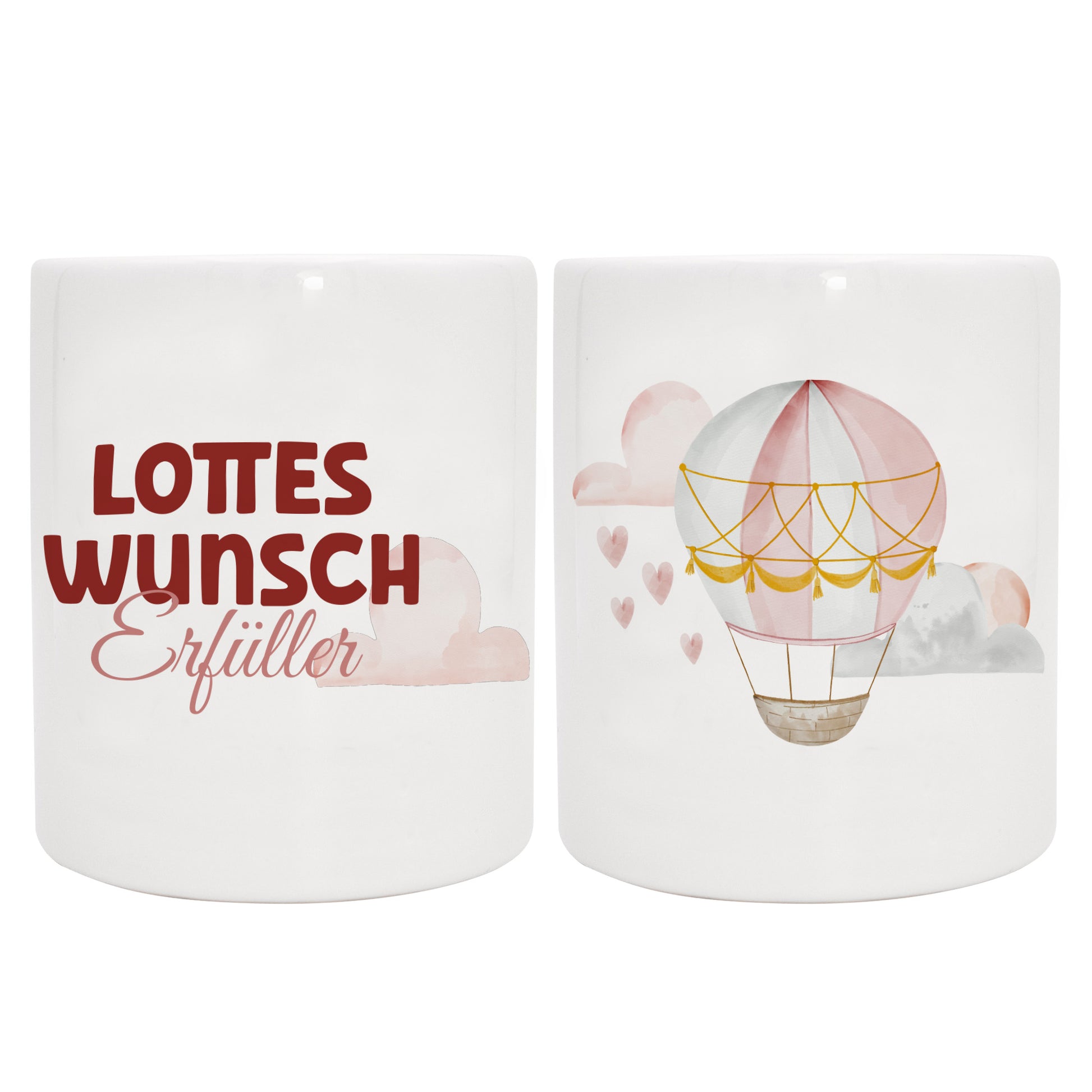 Die personalisierte Spardose „Wunsch Erfüller Rot“ ist mehr als nur eine gewöhnliche Spardose – sie ist ein einzigartiges Geschenk, das Freude und bleibende Erinnerungen schafft. Mit dem Schriftzug „Wunsch Erfüller“ auf einer Seite und der Möglichkeit, einen persönlichen Namen hinzuzufügen, wird diese Spardose zu einem ganz besonderen Unikat. Auf der anderen Seite erscheint ein bezauberndes Design mit einem Ballon, Wolken, Herzen und dem Mond – perfekt für alle, die an das Erfüllen ihrer Wünsche und Träume glauben.