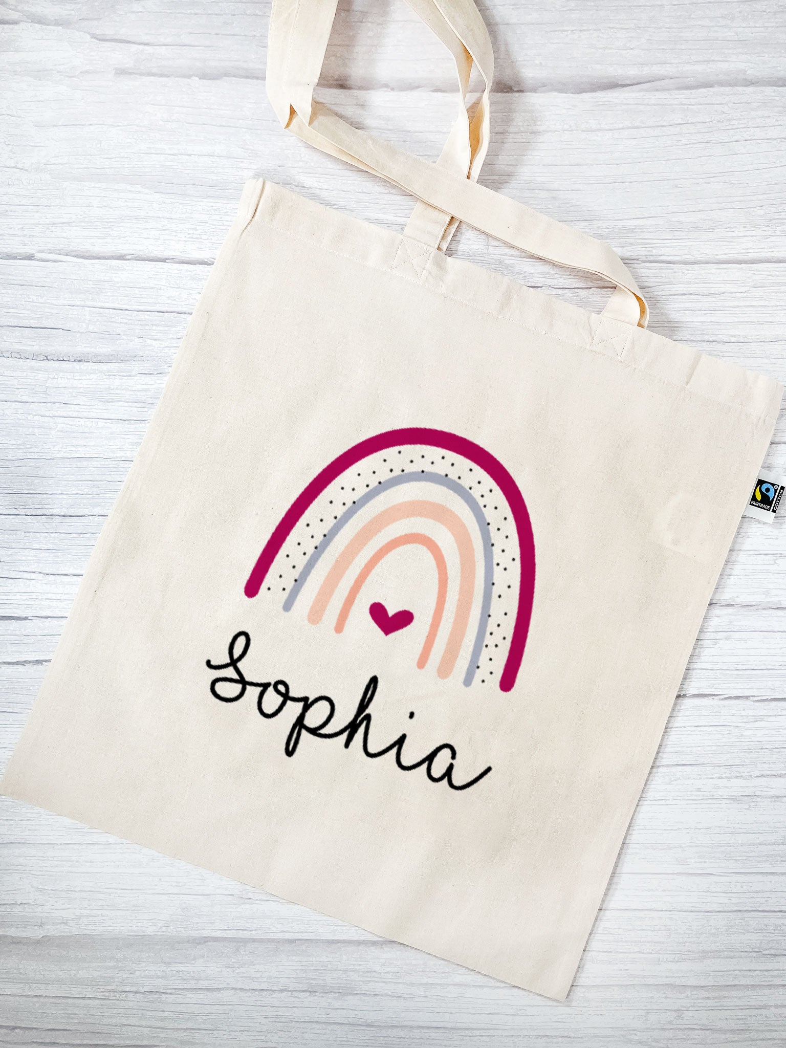 Einseitig bedruckte Stofftasche aus Bio-Baumwolle mit Wunschnamen und Regenbogen mit Herz.