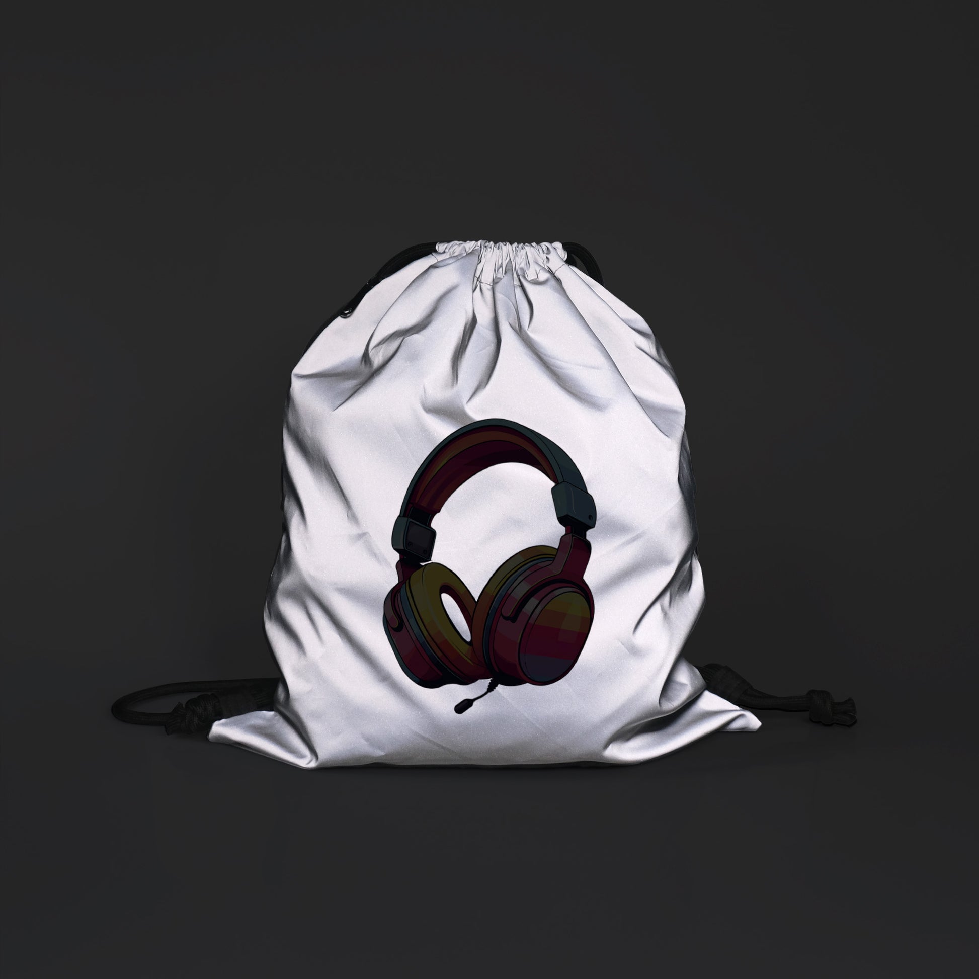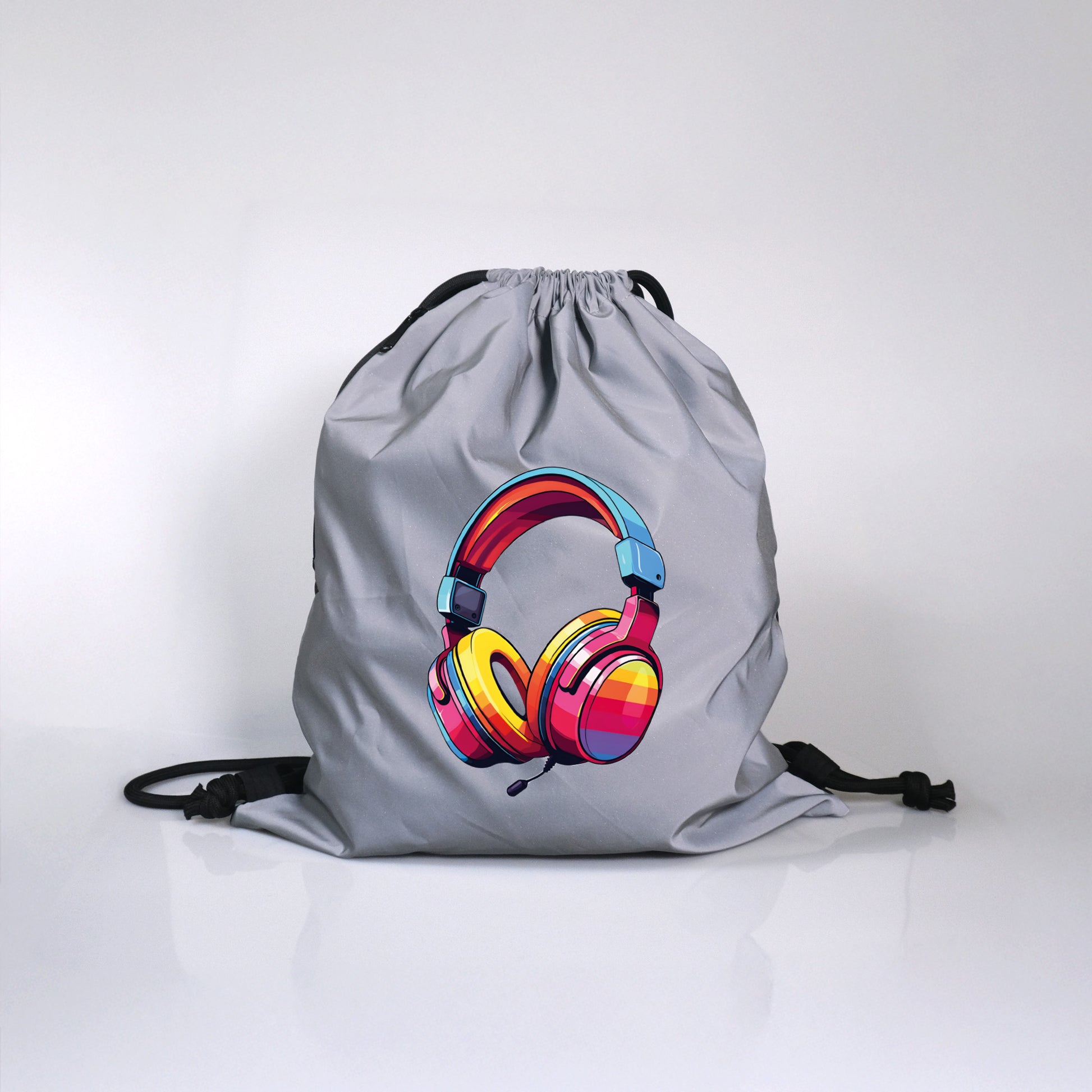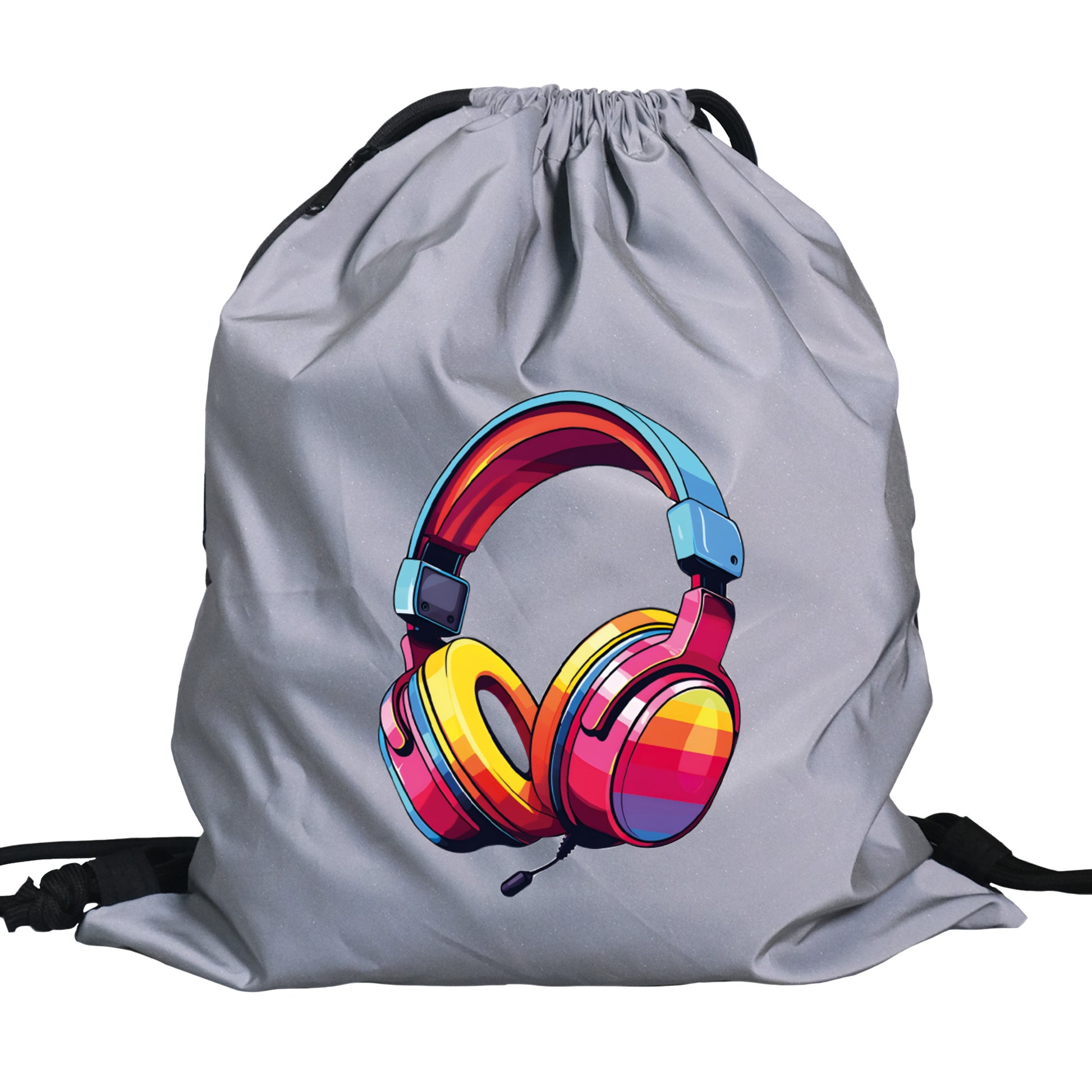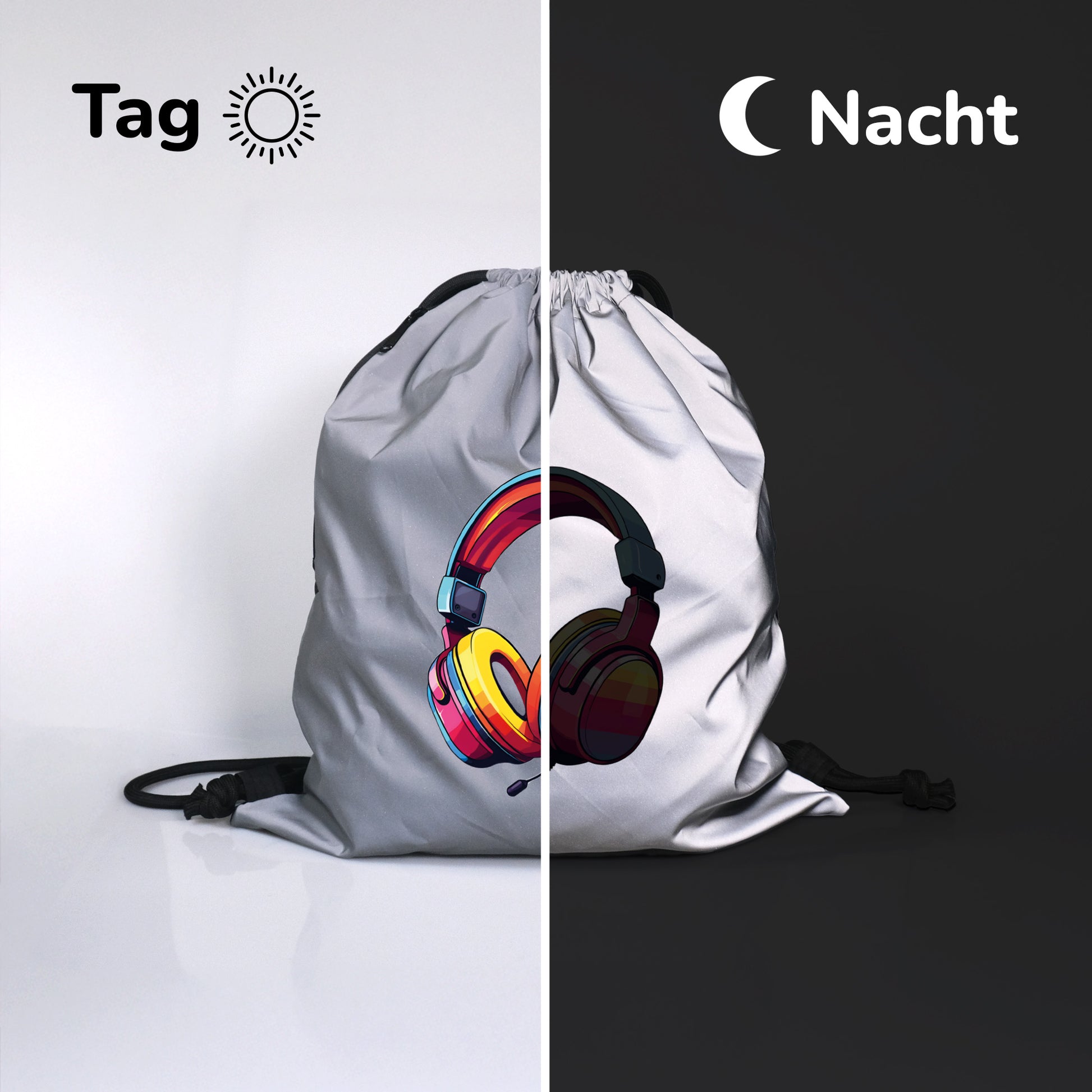 Der Turnbeutel ist auf der sichtbaren Seite grau und das Motiv Kopfhörer bunt, im dunkeln reflektiert die Beschichtung und das Motiv Kopfhörer ist fast schwarz.