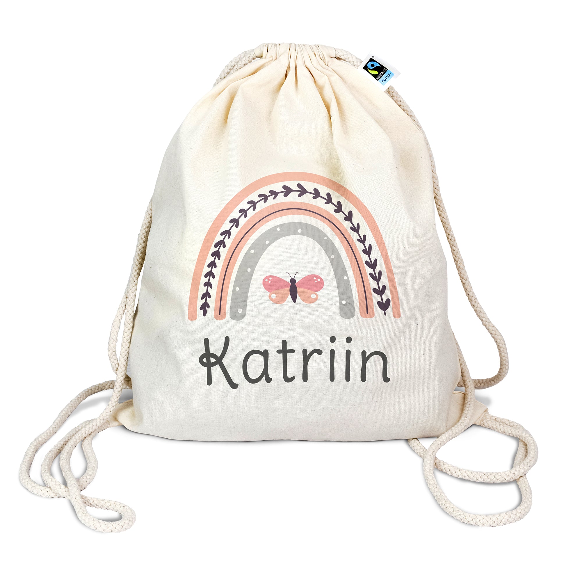 Turnbeutel aus Bio- Baumwolle mit Name | Regenbogen rosa + Schmetterling